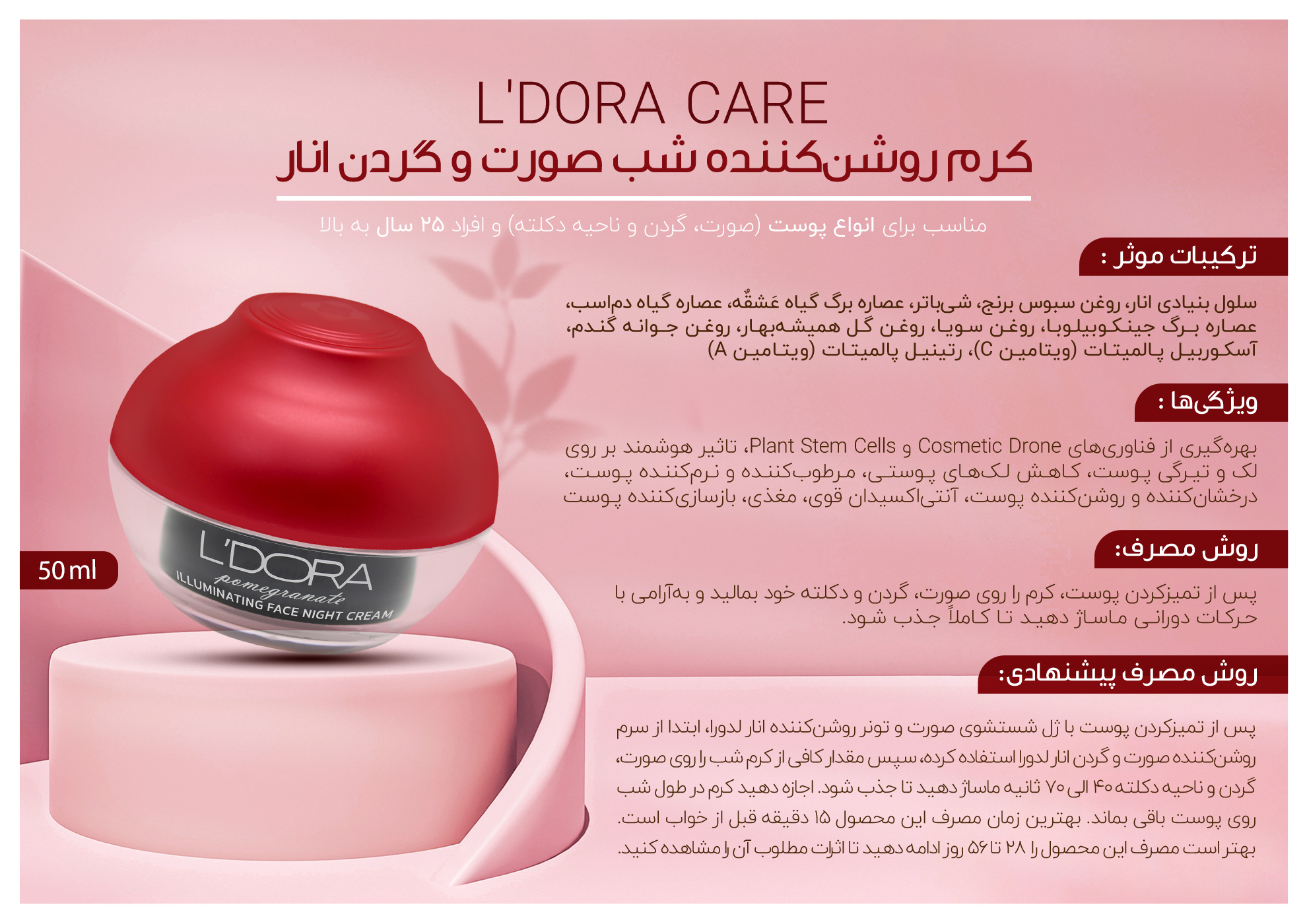 روش مصرف پيشنهادي: پس از تميز کردن پوست با ژل شستشوي صورت و تونر روشن کننده انار لدورا، ابتدا از سرم روشن کننده صورت و گردن انار لدورا استفاده کرده، سپس مقدار کافي از کرم شب را روي صورت، گردن و ناحيه دکلته 40 الي 70 ثانيه ماساژ دهيد تا جذب شود.