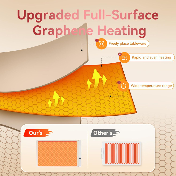 گرمایش سریع و یکنواخت: با استفاده از فناوری پیشرفته گرافن، سینی گرم کردن غذا توزیع یکنواخت و سریع گرما را در کل سطح فراهم می کند. پایه سیلیکونی ضد لغزش پایداری را تضمین می کند و در عین حال گرما را به طور موثر دفع می کند و عملکرد و ایمنی را در اولویت قرار می دهد.