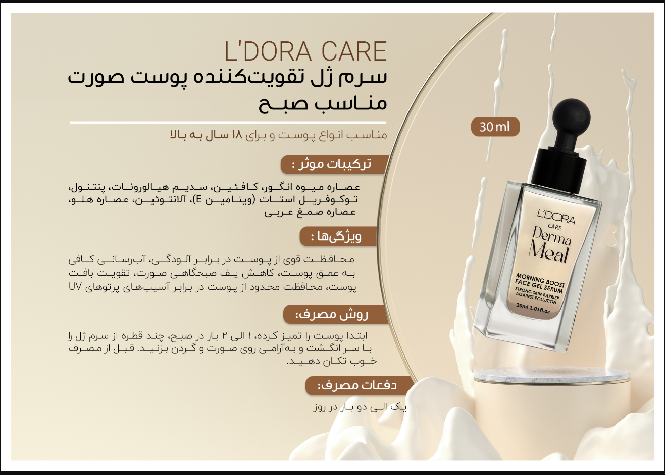 سرم ژل تقویتکننده پوست صورت مناسب صبح لدورا کر، مانند یک وعده صبحانه، سبک و مغذی است. این سرم ژل برای تامین رطوبت مورد نیاز، کاهش پف و تقویت سد محافظتی، به راحتی از پوست در طول روز مراقبت کرده و بدون ایجاد حس سنگینی، شادابی و درخششی طبیعی به آن میبخشد.
