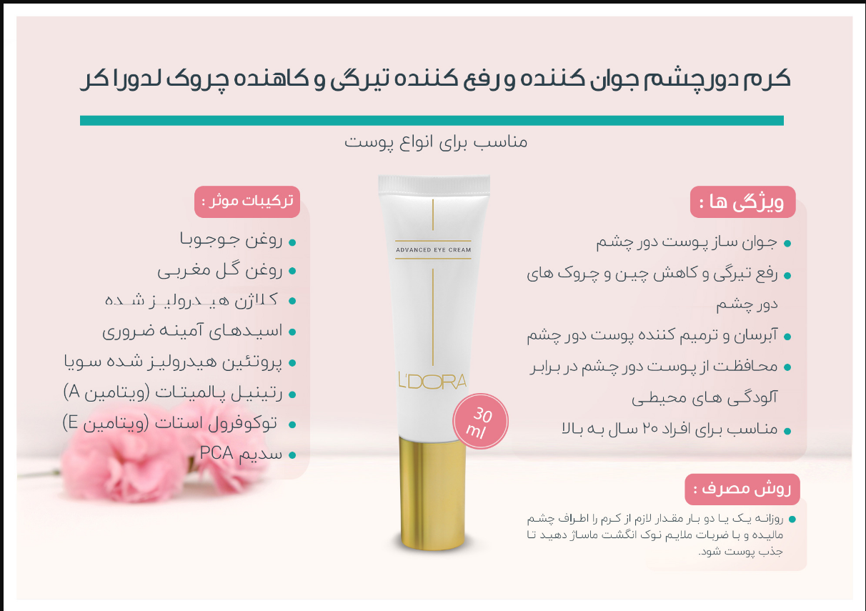 دستهبندی: کرم دور چشم L'DORA.: کرم دور چشم لدورا یک محصول کامل و بینظیر برای آبرسانی، ترمیم و محافظت دور چشم به شمار میرود.1: حجم/وزن 30 میلیلیتر2: جنس محفظه نگه دارنده پلاستیک3: گروه سنی 20 سال به بالا4 : ترکیبات موثر روغن جوجوبا، روغن گل مغربی، کلاژن هیدرولیز شده، اسیدهای آمینه ضروری، پروتئین هیدرولیز شده سویا، رتینیل پالمیتات (ویتامین A)، توکوفرول استات (ویتامین E)، سدیم PCA5 : ویژگی ها جوانساز پوست دور چشم، رفع تیرگی و کاهش چین و چروکهای دور چشم، آبرسان و ترمیمکننده پوست دور چشم، محافظت از پوست دور چشم در برابر آلودگیهای محیطی6 : مجوزها 3258771079737069نمایش بیشتر