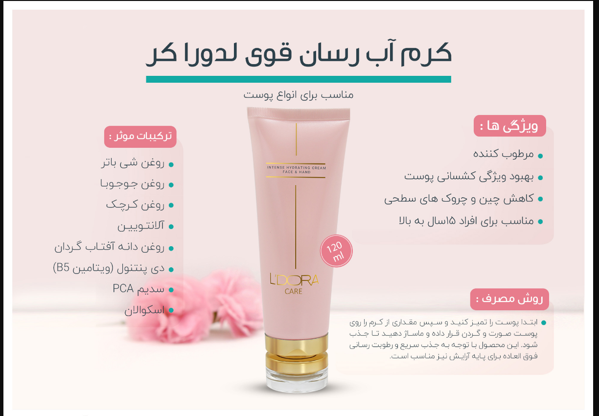 .: این محصول حرفهای یک مرطوبکننده مناسب برای انواع پوست است مواد موثر منحصر بهفرد موجود در کرم آبرسان قوی لدورا علاوه بر آبرسانی به بهبود ویژگی کشسانی (الاستیسیته) پوست نیز کمک میکند.