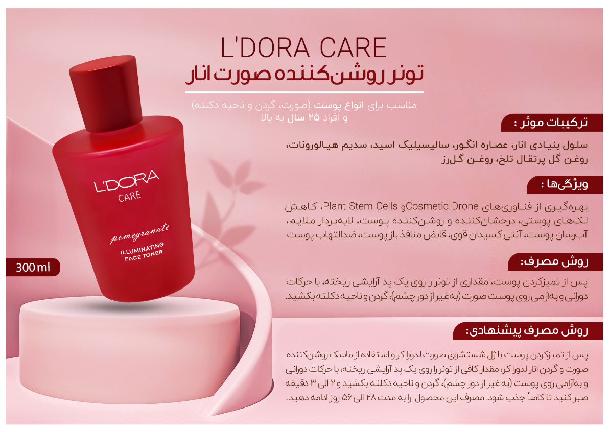 .: این تونر روشنکننده با بهرهگیری از فناوری پهباد آرایشی و سلولهای بنیادی انار برای شناسایی، کنترل و کاهش لکهای پوستی به کار میرود.